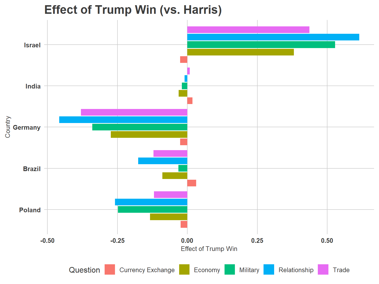 We then randomized the winner of the election and asked respondents if they thought economic, military, trade, and overall relationship between their country and the US would improve or worsen under the winner.